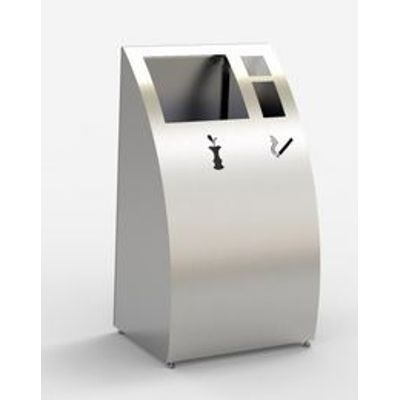 Two-compartment general and cigarette waste unit. There two waste compartments. Made of stainless steel or electrostatic painted metal material. There is a locked back cover. Thanks to the bag sling system, which can be used with standard bags, extra inner buckets are not required. One of the compartment was customized for the cigarette waste type. There is a metal inner bucket on the inside for the smoking compartment. The waste compartment is without a cover, the waste is hidden by the design of the form. The unit has fixed foot.