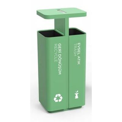 Two-compartment, outdoor litter and recycle bin with ashtray. Suga has two different compartments for recycling and trash. Two separate compartments provide the recyclable waste to be separated from the others. On the upper part there is an ashtray section and a buttress reservoir under the ashtray. Product is made of electrostatic painted 304 quality stainless steel material. The ashtray section is 304 quality stainless steel and it is unpainted. The type of waste is written in english and turkish with recycling and trash icons. There are two inner buckets in the product.