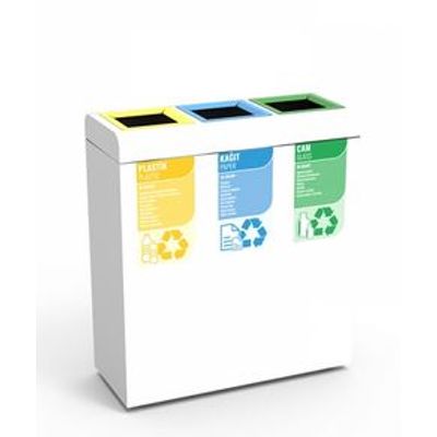 Three-compartment recycling unit. It is made of 304 quality stainless steel or electrostatic painted 430 quality stainless steel. It has an inner bucket and it is discharged from the top. Optionally, the inner bucket can be used with or without plastic bags. It has two option which is swing top lid and without the lid. It has also a hidden wheel system.