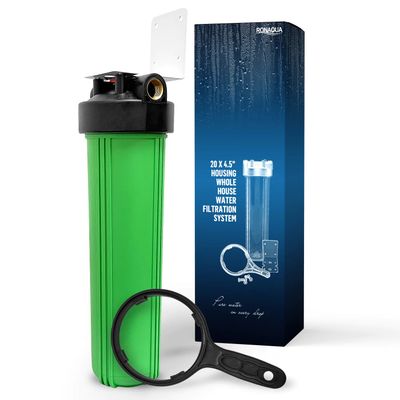 High Capacity 20 x 4.5” Green Whole House Filter Purifier System for Well or City Water, Presser Relief Button, 1” NPT Brass Port, Double O-Ring, Meets NSF Standards & Regulations. DURABLE STRUCTURE: 20”x 4.5” GreenHousing Set is proper for high-flow applications. The housing body is made of reinforced polypropylene for strength & resistance to chemicals, the black cap is made of high-flow polypropylene for toughness. Food grade material makes all filtered water is safe & healthy. The cap has 1" inlet/outlet brass ports which allowed better-sealed connections to the corresponding pipes. This unit is appropriate for well water, commercial & industrial filtration.