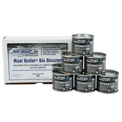 Rust Bullet Automotive Six Shooter - With its innovative new packaging, offers you the ultimate convenience with NO WASTE! The Rust Bullet Automotive Six Shooter contains six-four ounce cans of Rust Bullet Automotive, enough to cover approximately 12 square feet per coat per individual can (72 square feet per coat, per package). The Six Shooter is handy for those smaller projects and touch-ups and allows you to open medium amounts of Rust Bullet as it is needed, providing you the ultimate convenience. Metallic Grey in color.
