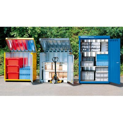 The Galvanized Storage Box as a Mobile Small Parts Storage. With their large hinged door and opening roof, the galvanized storage boxes are particularly easy and convenient to load. Gas struts make it easy to open and close the roff. With FLADAFI® galvanized storage boxes, you get a compact and convenient storage system that is also mobile and theft-proof.
