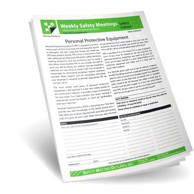 Select your topics. Weekly Safety Meeting, printed on paper, personalized with your company name, mailed annually in one package of 52 meetings or monthly in packages of four or five meetings. Select Edition allows you to pick and choose the Safety Meetings that you feel are best suited to your work. You select the 52 topics that you want to train with and choose when you receive them. You can opt to have all 52 meetings delivered at once, or have them delivered monthly throughout the year. Regardless of your delivery preference you’ll receive your 52 Manufacturing Safety Meetings, personalized with your company name, on an easy to read, plain-paper form.