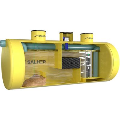 The hydrocarbon separators designed by Salher are manufactured in GFRP (Glass Fiber Reinforced Polyester) and sized in accordance with EN 858. They separate mineral oil and grease and hydrocarbon from water.