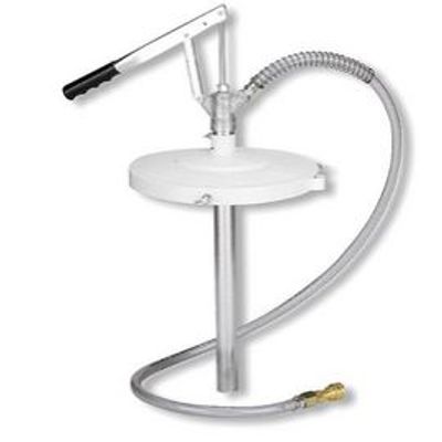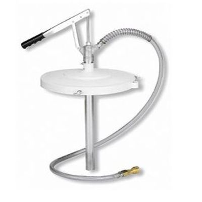 Filler pump for centralized greasing systems, 50 kg drums. Includes a 405 mm drum cover. Medium pressure lever action pump with 1,5 m hose and a 2-HK (1/4") hydraulic connector for filling the reservoir of centralized greasing systems. Includes pump, cover, hose, and hydraulic connector.