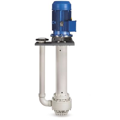 GP Series vertical pumps. Machined from a solid block of polypropylene, these are very robust chemical pumps ideal for heavy-duty and continuous operations. Maximum length: 3000 mm. Max flow rate: 200 m³/h. Max head: 42 m w.c. Plastic construction materials: PP.