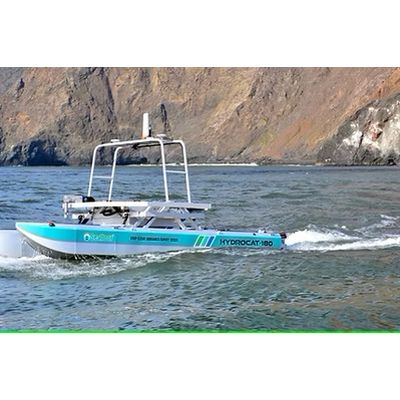The HydroCat-550™ USV is capable of transiting from inshore to nearshore environments with high-resolution equipment payloads to conduct preplanned autonomous hydrographic surveys. The 5.5m (18ft) catamaran features individually-articulating pontoons, a gimballed deck, retractable sonar pole mount, and independently-actuated electric motors. The vessel can be transported via trailer, programmed to execute missions, and navigate up to sea state 5 conditions with its aluminum hull construction.