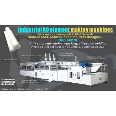 This is fully automatic industrial RO carrier membrane automatic slicing, indexing, and welding machine. The machine is able to cut the carrier membrane to its designed length, layout with indexing distant, and welding them together one by one. Operators only need to load the membrane material in roll upon the racks, set parameters, press the start button, the machine will produce automatically, absolutely no labor needed in between till material was completed. It is easy operation, stable production, safety, reliability and high efficiency.Model SEC-4880GL - Automatic domestic RO cartridge element rolling machine (fully automatic)