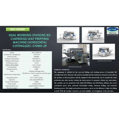 Equipment introduction: The equipment is using for industrial RO membrane cartridge element rolling. Two people operate at the same time. The tricot leaves are manually place on the rolling table, and the machine automatically performs dispensing and winding. The operating table will rise accordingly to the number of measured layers of the membrane. While decreasing to keep the dispensing surface height consistent, the dispensing line stable, and good winding result. At the same time, the device is compatible with automatic dispensing winding, and the winding tension can be adjusting accordingly. The machine is safe and stable operation and high efficient, it is suitable for 4-8 inches type of cartridge element productions.Model SEC-3880 - RO cartridge element carrier membrane prepping machine