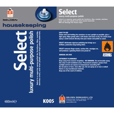 Select is a superior silicone based spray polish for furniture , tiles, marble, stainless steel, and most plastic and vinyl coated materials. SELECT removes finger marks, surface dirt, smudges etc, and produces a glowing finish to be proud of.