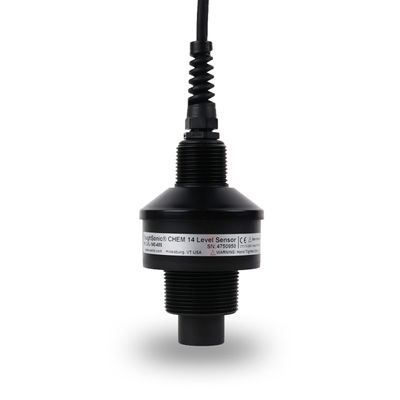 Product code: TS-200.14. Minimum Purchase: 1 unit. Max Measuring Distance: 14 ft (4.3 m). Optimum Measuring Distance: 10 ft (3 m). Deadband: < 3.5" (89 mm). Temperature Range: -40° to 158° F (-40° to 70° C). Protection: NEMA 4X, IP 68, NEMA 6P. Area Classification: Ordinary Locations. Cable Length: 6.5 feet. Mount: 1" NPT Thread Upper, 1.5" NPT Thread Lower. Dimensions (L x Dia): 4.99 in (126 mm) x 3.04 in (77 mm). Housing: PVDF. Legacy Part Number: LVL-140-485, LVL-140-232. Output: RS-485 or RS-232.
