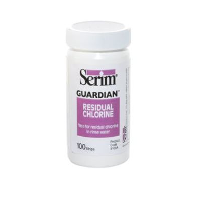 Serim® GUARDIAN™ RESIDUAL CHLORINE Test Strips provide a rapid and convenient means for indicating the concentration of chlorine bleach (sodium hypochlorite) remaining in the solution used to rinse dialysate lines following disinfection of hemodialysis equipment. The qualitative rapid screening method can be used to determine that chlorine has been adequately rinsed from the machine. The semi-quantitative method may be useful where corrective measures are undertaken on machines dispensing unacceptable levels of chlorine for extended periods and for testing containers, i.e., “bicarb jugs,” disinfected with bleach. Results of 0.5 ppm or above indicate that further rinsing is necessary. For more information refer to the Residual Chlorine product insert.