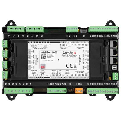 Cooperation with up to 64 gen-set/mains/tie controllers. Direct communication with ECUs. Secure remote control and monitoring. Highly flexible yet configurable solution for switchgear applications. Hardware compliant to the latest switchgear market needs. State of the art AC accuracy measurement which allows it to be used on primary frequency control mechanism, grid balancing and demand response projects. Cybersecurity by design, compliant to the ISA62433 standard. A variety of both local and remote monitoring options, with a high number of connected clients split into “trusted” and “untrusted” zones. Mains parallel operation with support of Grid Codes, compliant to European Grid codes ( EN 50549, VDE-AR-N 4110:2018, VDE-AR-N 4105:2019, G99, TOR), American IEEE 1547 and others. Multiple Island operation with cooperation with up to 64 additional gen-set/mains/tie controllers (InteliGen 1000 or InteliMains 1010). Several load transfer options with the possibility of less than 100ms load transfer. Redundant inter-controller line for critical applications like datacentres and hospitals. Double redundancy of the kW and kVAr sharing. User management allowing up to 30 unique users. AirGate 2.0 makes sure that the connection to the controller is established faster from all around the world, and is more reliable than ever before.. Internal PLC interpreter with an easy to use PLC Editor, for simple and fast creation of specific logic. Up to 31 characters in texts, parameters, and alarms for system clarity and easy troubleshooting. Compatibility with ComAp InteliGen/InteliSys/InteliMains-NT line, InteliGen 200, InteliGen500 controllers. Enable/Disable of features and protections makes the system highly versatile yet simple and easy for both commissioning engineers and operators.