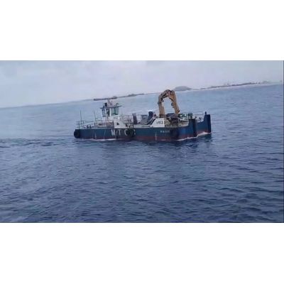 She is of all welded steel construction ,bottom plate 8 mm thickness and shell plating 6 mm thickness, frame distance 500 mm, with 2 fixed spuds on the aft ,ladder support A frame in the front and 3 hydraulic operated winches ,2 double bollards(fwd and aft) and 1 single bollard in the center on each side.
