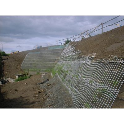 GridLok is a complete soil reinforcement system which uses steel mesh panels and inextensible steel soil reinforcements to create steep slopes and near-vertical walls. Comprised of steel mesh face panels interlaced with horizontal tensile bars, Gridlok is an effective method of soil reinforcement. Reinforced soil slopes are generally in the range of 60°-70° and upon completion can be given a vegitative surface. The greened finish is normally provided by hand seeding the topsoil during filling or hydroseeding the finished structure.
