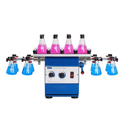 The machine is constructed to hold flasks from 100 ml to 1000 ml. the shaking speed action is variable and is controlled by speed regulator fitted with fractional H.P. motor to work on 220 volts AC. Complete with cord and plug. To hold 4 flasks, To hold 8 flasks