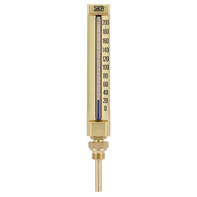The original SIKA thermometer with high-quality V-shaped aluminium casing, smoothly polished on all sides, anodised in golden colour. The numbers of the display range are printed in black on the right-hand side of the scale under the anodised layer. The print is thus permanently and indissolubly fixed in the anodised layer. Our thermometer is available as standard in three nominal sizes, each in straight or angled 90° version and many display ranges from -30...50 °C to 0...250 °C. In addition, immersion tubes optionally made of brass, steel, stainless steel, special brass or copper nickel alloy and a variety of selectable connection types and threads. Our standard range of industrial thermometers contains a total of more than 17,000 different variants.