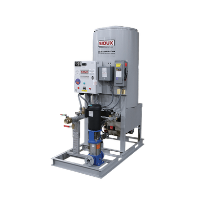 If you need a larger water tank, Sioux offers the NextGen HWP with a 1MBTU/Hr WH Series water heater and a 1,000 gallon atmospherically vented water tank. A single stage centrifugal pump with a 3-HP motor is included for circulation through the heat exchanger and a single stage centrifugal pump with a 7.5-HP motor capable of 180 GPM @ 90 ft of head for the discharge pump. Connect the inlet and outlet water, plus utilities, and you are ready to make hot water.