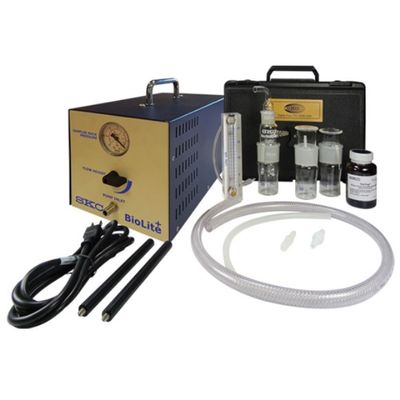 The Deluxe BioSampler System includes 1 BioSampler, two additional 20-ml collection vessels with caps, 1 case with mounting rod, 1 ViaTrap (120 ml), 1 BioLite pump, tubing/adapters, and rotameter, 115 V.