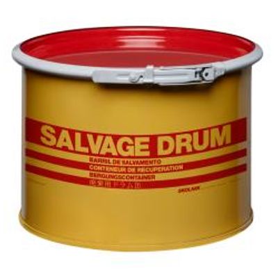 A Skolnik Open Head Salvage Drum is constructed of high quality carbon steel and meets the UN design type requirements. Standard Salvage Drums feature yellow bodies with yellow or red covers, with a multilingual salvage drum logo in red. Available options include 3/4" vent plugs and corrosion resistant epoxy phenolic lining. Each Skolnik Steel Salvage Drum tests successfully on relevant international standards, including the "T rated salvage drum.