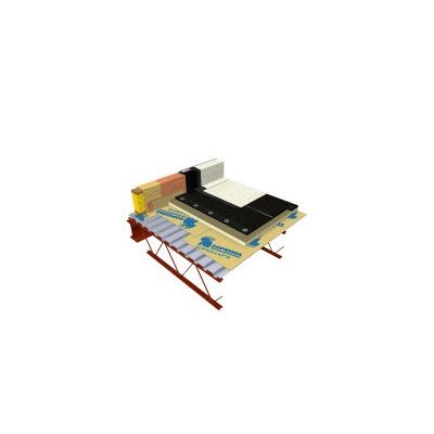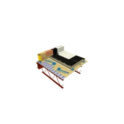 Support panel composed of a 180 g/m² non-woven polyester reinforced SBS membrane with thermofusible surface, laminated on a 100 psi high density polyisocyanurate insulation panel.