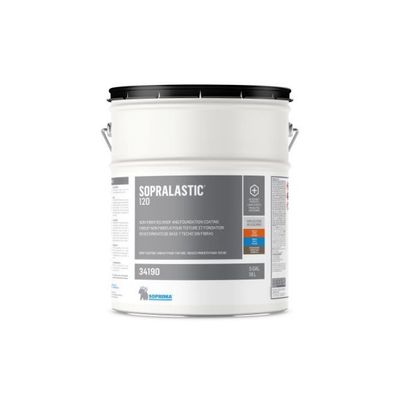 Non-fibrous bitumen coating applied with a brush or a roller. SOPRALASTIC 120 is a bitumen-based non fibrated roof and foundation coating. It can be used as a protective coating on metal and asphalt surfaces. Mainly used to revitalize existing roofs, its special formulation also makes it a good product for dampproofing of foundation walls.