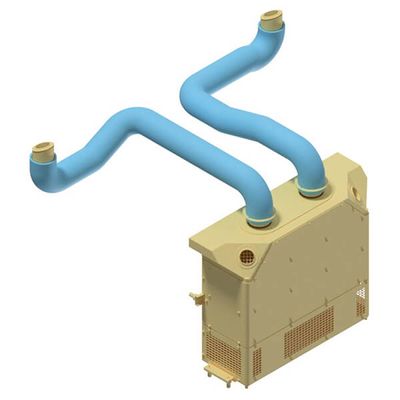 The INTEGRATED CAB HVAC is an 8.0kW evaporator air conditioning and 3.0kW heating system. The evaporator is an integrated boxed enclosure which is mounted inside the cab, center front of the dash. The ducting interface is flexible and custom designed to suit the cab and dash specific-layout. Mounting brackets are designed to suit the required interfaces. The evaporator has 2 dual scroll blowers to allow for high pressure losses in constrained air ducts. A condenser pack in enclosed condenser unit is included, which is mounted on the outside of the front cab as a separate module containing condenser, heat exchanger and cooling fans. The 121cc displacement (motor driven) compressor is mounted directly on a separate 74VDC motor, including clutch. DC to DC power inverter is mounted outside cabin.
