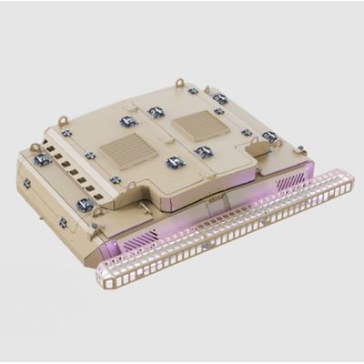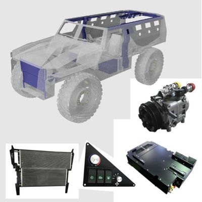 Roof mounted modular air conditioning system (ACU) to supply 14kW cooling to ensure a cabin temperature of 23 - 26°C max in a 55°C ambient, provided the vehicle is thermally insulated. The aircon is a single evaporator design with a single 313cc compressor belt driven on the APU engine. The APU/ACU system does not restrict the standard operational features of the vehicle in terms of firing and mobility. The system uses quick coupler connections so that the APU system can be removed without losing the refrigerant charge. The electrical connections, looms between the aircon, power units, electronic control panels and electrical control gear are designed and selected for operation in military environments, which include adverse temperatures as well as severe shock and vibration.