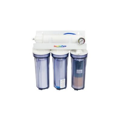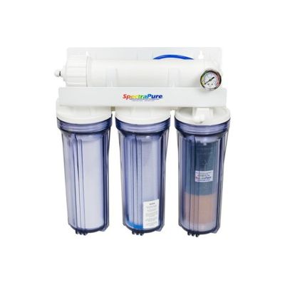 SpectraPure® Refurbished 90-GPD 4-Stage RO/DI System Rebuilt with new fittings and housings where needed, std 90gpd RO membrane, 1um pre-filters, color-indicating SilicaBuster™ DI cartridge, pressure gauge, and garden hose adapter. This RODI System incorporates a high-silicate removal TFC membrane, 1 micron MicroTec™ Sediment and Carbon Block Filters, and a custom formulated 10in Color-Change DI Cartridge. High-purity water at an economical price, maximizing pure water production through application of the commercial-grade deionization resins used in our specialty deionization cartridges.