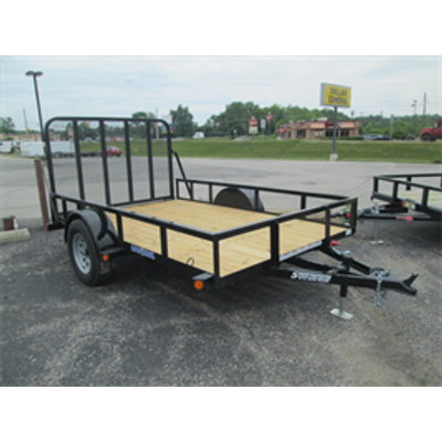 2014 77x10 Load Trail utility with 3500lb. Dexter idler axle, 205/75R15 8-ply tires, 2" A-frame coupler, treated wood floor, weld-on smooth plate fenders, 4' spring assist fold gate, 5k swivel jack, weld-on side rails, and LED lights.