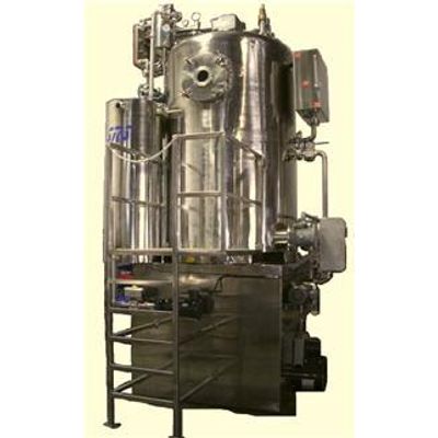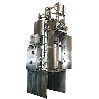 The SRV-Series is designed for system sizes handling 25-250 gallons per hour and is the simplest and highest performance system design in its price range. It is composed of a non-scraped vessel with a 70 cone design which incorporates a unique steep walled distillation chamber. This is surrounded by a large volume oil bath heated with electric immersion heaters or optional steam coils. The design provides excellent heat transfer characteristics because of the large surface area in contact with the solvent and the oil media. In most applications, the steep walls keep the inside surfaces of the distillation chamber free of sludge build-up for maximum heat transfer from the hot oil media, and assists in discharging the sludge from a bottom mounted 6″ discharge valve.