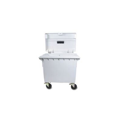 The 4 wheel collection container has a narrow design and solid rubber casters which allow container to fit through doors with ease. With three handles on the free swinging lid, the 4 Wheel cart provides ease and efficiency for your large capacity container needs.