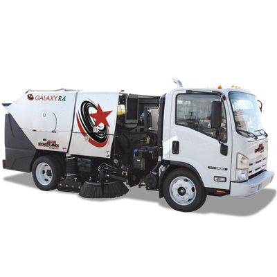 The Galaxy R-4 is a 4 cubic yard regenerative air street sweeper mounted on a compact, highly maneuverable non-CDL cab-over chassis. Designed for reliability and simplicity, this street sweeper features a blast orifice style sweeping hood that generates powerful airflow, making it efficient in deep cleaning road surfaces. With a 19,500# GVWR chassis, it offers an 18-foot turning radius, accommodating tight spaces. The sweeper is equipped with a 4.65 cubic yard hopper for reduced dump cycles, a 130-gallon polyethylene water tank for dust control, and a 74 HP Kubota turbocharged diesel engine for powerful performance. Additional features include a 30-inch high-pressure steel fan, color camera system, ergonomic controls, and a variety of stainless steel components ensuring durability and easy maintenance. The Galaxy R-4 is especially suitable for roads, alleyways, parking lots, and other congested areas, providing a robust solution for thorough and efficient sweeping operations.