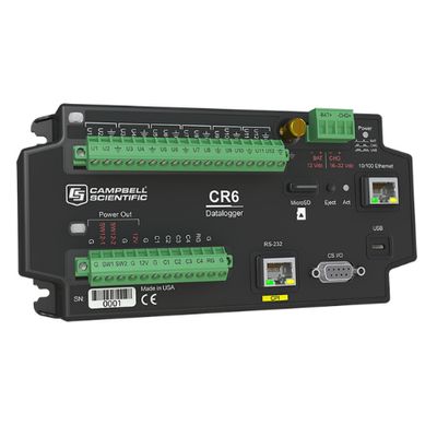 The CR6 measurement and control datalogger is a powerful core component for your data-acquisition system. It combines the best features of the CR range of dataloggers with added faster communication, low power requirements, built in USB, compact size, and improved analogue input accuracy and resolution. The CR6 also introduces the new universal (U) terminal, an ingenious way to allow virtually any sensor, analogue, digital, or smart, to be connected to any U terminal. It is also capable of making static vibrating-wire measurements.