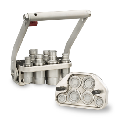 The DP Series of Multi-Coupling Plates allows the simultaneous couple and uncouple of two, four, or six hydraulic and/or electrical lines with a single, simple movement requiring very little force. The circuit lines can all have the same coupler nominal diameter and different media. A dust cap is supplied, and options include: an electrical connector for low voltage requirements and a parking station.