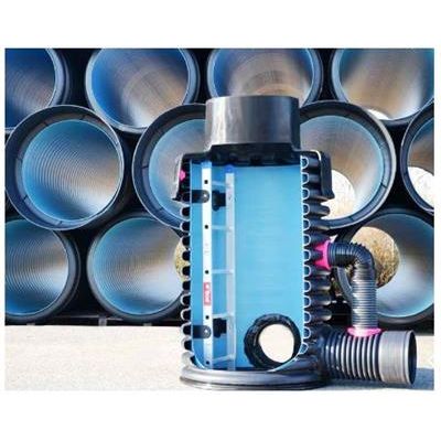 Raw material - high density polyethylene (HDPE) + Polypropylene (PP). Wall structure - Double Wall (corrugated exterior / smooth interior). Range of diameters - Nominal internal diameter from ø1200 mm up to ø2500 mm. Colors - BLACK on the outside (with UV protection), BLUE on the inside. Manufacturing standard - UNE EN 13476-3 European standard | ISO 21138-3 International standard | DIN 16961. Ring stiffness - SN8 (≥ 8 kN / m 2 ) - SN4 (≥ 4 kN / m 2 ) - SN2 (≥ 2 kN / m 2 ) . Applications - Sewer, storm drainage and buried drainage systems.