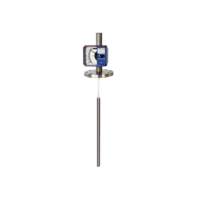 According to Archimedes principle of body submerged in a liquid. A float with a density similar to the measured liquid is suspended by a spring to maintain an equilibrium with its weight. This float is always submerged in the liquid (not floating on the surface). A variation in the liquid level produces a change in the weight of the float (partially submerged), which can be measured by the extension or compression of the spring that supports the float . The variation in the length of the spring is transmitted to the indicating needle via a magnetic coupling .