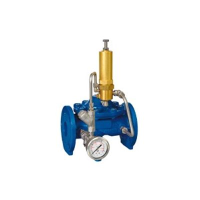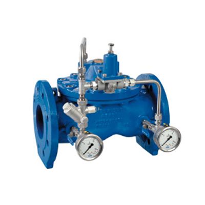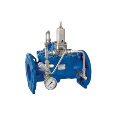 The valve reduces high upstream pressure to a pre-set lower and constant downstream pressure level, regardless of fluctuating flow or varying upstream pressure. A hydraulic regulating pilot drives the valve. The pilot is able to detect upstream pressure values and regulates closing steps of the valve until the pre-set pressure value is restored.
