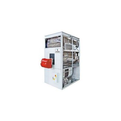 The CONDENSING WARM AIR HEATER ENERGY provides controlled heating of the air to be supplied to residential, commercial and industrial premises. The equipment consist mainly of an isolated cabinet receiving the air flow produced by the ventilator group. The cabinet contains a high-efficiency INOX stainless steel heat exchanger which transfers the thermal power by means of direct exchange between combustion products and the air flow to be treated. Such air is heated when passing onto the exchanger’s hot surface and it is then distributed to the premises. The centrifugal fan’s characteristics make the equipment suitable to be installed where air is to be distributed through pipings or – more generally – where high static pressure is requied. During summertime, this equipment can also perform room ventilation only.