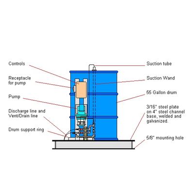 The chemical feed pump rate is adjustable from 2.5 to 50 gallons per day at 25 PSI. Chemical dosing is controlled by a 24 hour or 7-day programmable timer capable of up to 10 on/off cycles per day. A bypass valve vents the chemical in an overpressure condition. Unit operates on 120 volts AC and 100 hour capacitor back-up of memory and display. Unit is available housed with room for 55 gallon drum, and unhoused (as shown). A hydrogen peroxide dilute solution is generally used, although unit is capable of handling approximately 200 different chemicals.