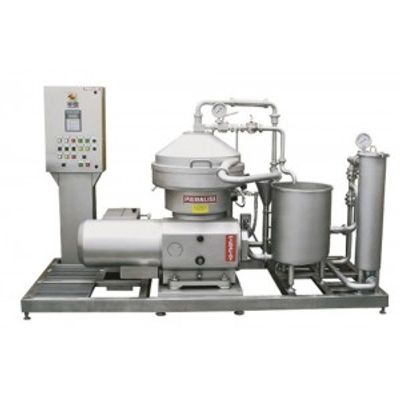 Base casing in painted cast-iron. Centrifugal clutch (replaceable linings). Oil bath drive gear. IP55 version motor. Motor protection cover in stainless steel. Complete bowl in high resistance stainless steel. Upper casing in stainless steel. Sediment collector and discharge system in stainless steel. 2 centripetal pumps for pressure discharging of the two separated phases (skimmed milk and cream). Pressure gauges for regulating the backpressure. Skimmed milk outflow. Cream outflow. Product feed. Micrometric regulating valves in stainless steel. Washing pipes and taps in stainless steel. Spare gaskets and disks. Special tools, carter oil and basic outfit.