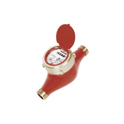 Multi-jet semi-dry type. 360° rotatable cover. Display on 5 drums m3 and 4 pointers for litres. Optional check valve. Measuring range up to R160. Optional pulse, M-bus Radio frequency output. Brass housing. Glycerin filled register unit. Water temperature up to 50°C.