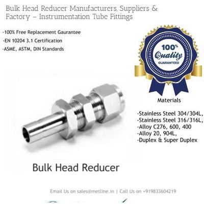 Metline offers one of the largest selections of compression tube fittings in the industry. Metline is a specialized manufacturer of bulk head reducers in various material choices including 304/304L 316L Brass. Monel Alloy 400, Titanium Hastelloy Alloy C276. Alloy 20. and Inconel 600 alloys. Stainless steel 316L and Stainless Steel 304/304L bulk head reducers are most widely recommended option for corrosive gases and high purity applications due to its superior resistance, non-reactivity, exceptional durability and high-surface finish properties. It is compatible with most gas types and low-velocity oxygen applications.