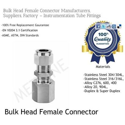 Meiline offers one of the largest selections of compression tube fittings in the industry. Metline is a specialized manufacturer of ferrule bulkhead female connector (1 /8" to 2") in various material choices including stainless steel 304/304L stainless steel 316L Brass, Monel Alloy 400, Titanium. Hastelloy Alloy C276. Alloy 20, 904L and Inconel 600 alloys. Stainless steel 316L bulkhead female connector and stainless steel 304/304L bulkhead female connector are most widely recommended option for corrosive gases and high purity applications due to its superior resistance, non-reactivity, exceptional durability and high-surface finish properties. It is compatible with most gas types and low-velocity oxygen applications.