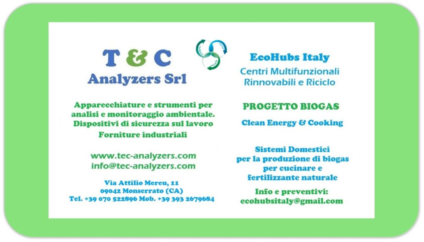 Industrial supplies for environmental analysis and monitoring, workers safety, confined spaces, laboratory and process instrumentation. Equipment for waters and industrial liquids monitoring and analysis. Air & Gases monitoring equipment. Scientific and laboratory equipment. Odour and greenhouse gases removal on wasted waters plants. New Renewable Division: BIOGAS & SOLAR ENERGY Home biogas digesters: to convert food wastes in clean fuel and promote a clean kitchen. Biogas bags to use biogas wherever you are! Please write us to ecohubsitaly@gmail.com