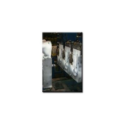 For higher volume orders we implement permanent mold tooling to combat the price per part for aluminum castings. Given a large enough production run permanent mold tooling can pay for itself and minimize lead times. As opposed to packing sand around a pattern to create the cavity for the part, a piece of iron is milled to the appropriate geometry to produce the mold. Once the mold is produced it can be indexed into a vault and pulled anytime the part needs to be run. Whenever possible multiple cavities are machined into a single mold to maximize the number of parts per pour. A single permanent mold can yield thousands of parts and can do so with great consistency. The surface finish and tolerance is comparable to that of die casting.