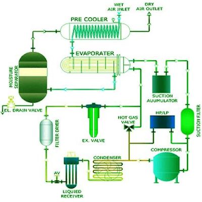 The simplest way of removing moisture from compressed air is to reduce the temperature. In this TRIMECH dryer compressed air is passed through a heat interchanger where cold refrigerant at around 3 Deg C is passed through the other side of the heat interchanger. At this temperature most of the moisture is condensed which is then separated and drained out in
