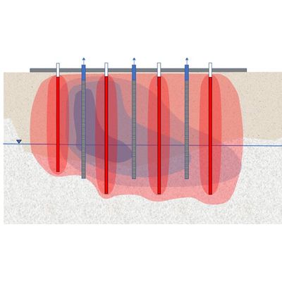 FlexHeater TCH Remediation Services, applied in situ or ex situ for the treatment of VOCs and SVOCs, involves heating narrow diameter steel pipes to many hundreds of degrees Celsius. The heat propagates radially away from the pipes, evaporating the contaminants. Applying the flexible, patented heaters, TRS can achieve temperatures in the vadose zone and ex situ cells high enough to volatilize high boiling contaminants, including PAHs, PCBs, and PFAS. The FlexHeater remediation is effective in all types of soil and bedrock, typically achieving 99% or more contaminant concentration reductions.