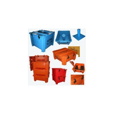 Custom Designed Plastic Containers for Stacked Storage.We have developed a new design to withstand heavy static stacking forces. This design offers a lifetime of protected transport and storage for critical and high‐value components. We can mold this design to almost any specified size. Positioning and cushioning inserts can also be molded to fit inside our container to cradle your valuable components. Foam sourcing services are also available. Will not rust, dent, chip, or corrode. Value added options include a hinged lid, stenciling or labeling and special cinch attachments. Standard available colors are dark gray, yellow, blue or natural white. Orange is available by special order.