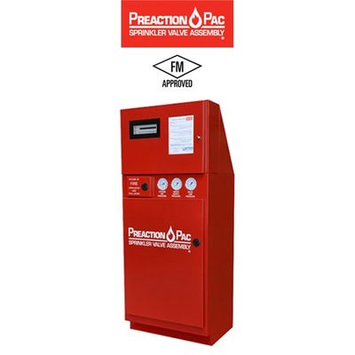 PREACTION-PAC™ is a Factory Mutual (FM) Approved, fully integrated preaction fire suppression assembly. This preaction cabinet includes a preaction valve, compressor, and control panel providing one complete zone of preaction water sprinkler fire protection. All components of this preaction fire sprinkler system are contained in two steel enclosures assembled one above the other. The system pressure gauges and the manual release handle are mounted on the front of the lower enclosure. The system detection and control panel is mounted behind a door in the upper enclosure with a clear polycarbonate window allowing visual access to the system indicators. Lockable latches on both doors permit authorized access to all system components. Both enclosures are finished in powder-coat red paint. Gasketing provides sealing of the enclosure doors and knockouts permit easy attachment of external electrical conduits.